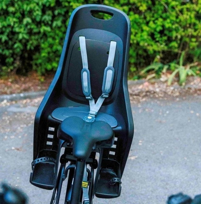 Nos sièges enfant sont facilement clipsables sur le support arrière des vélos électriques de type Touring, Confort et city, en location chez Aix bike.