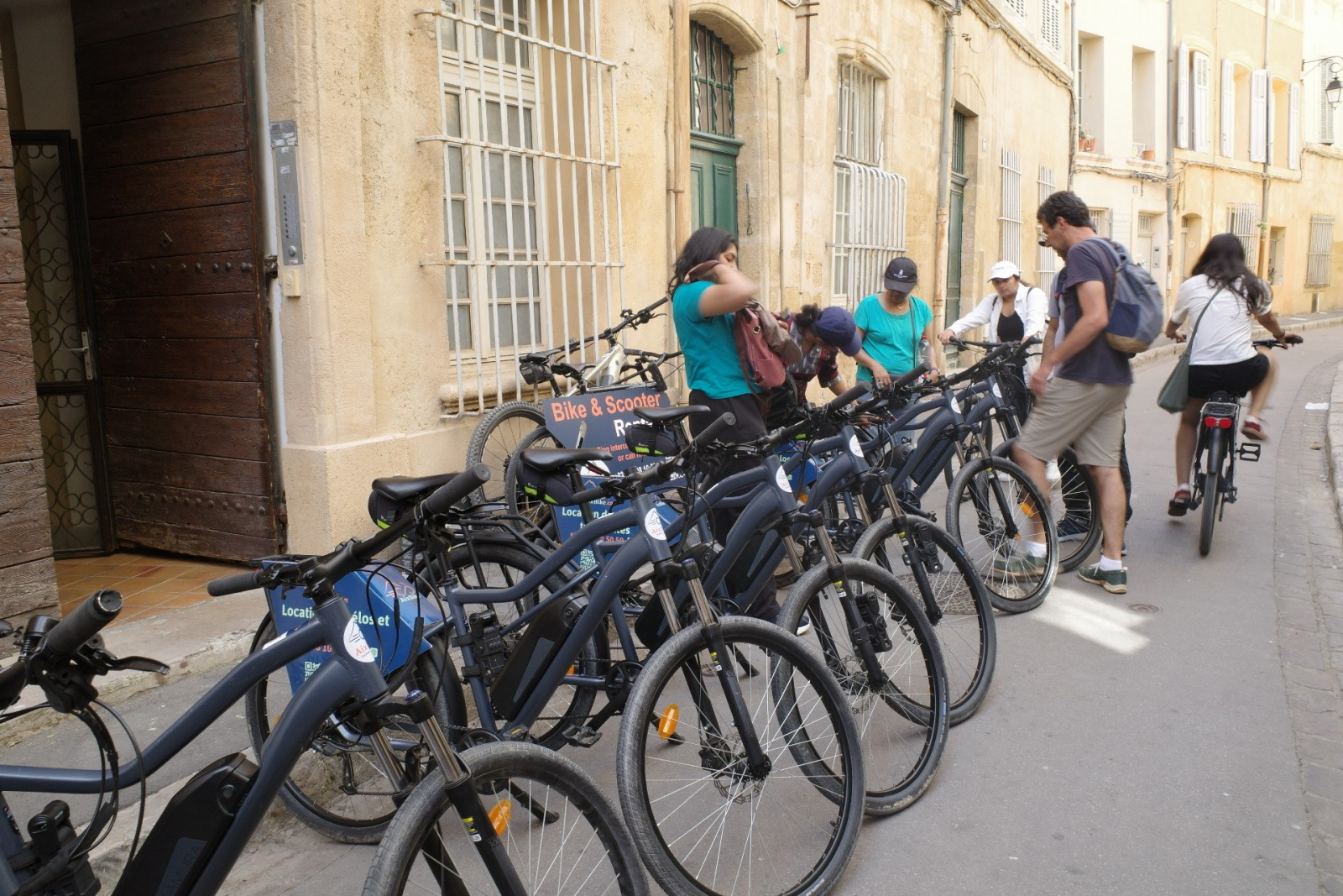 Un groupe prêt à partir à la découverte d’Aix-en-Provence à vélo ! Chez AixBike, nous livrons directement vos vélos électriques ou musculaires où vous en avez besoin – hôtels, centres-villes, ou lieux de départ de vos balades. Confort, autonomie et plaisir garantis !